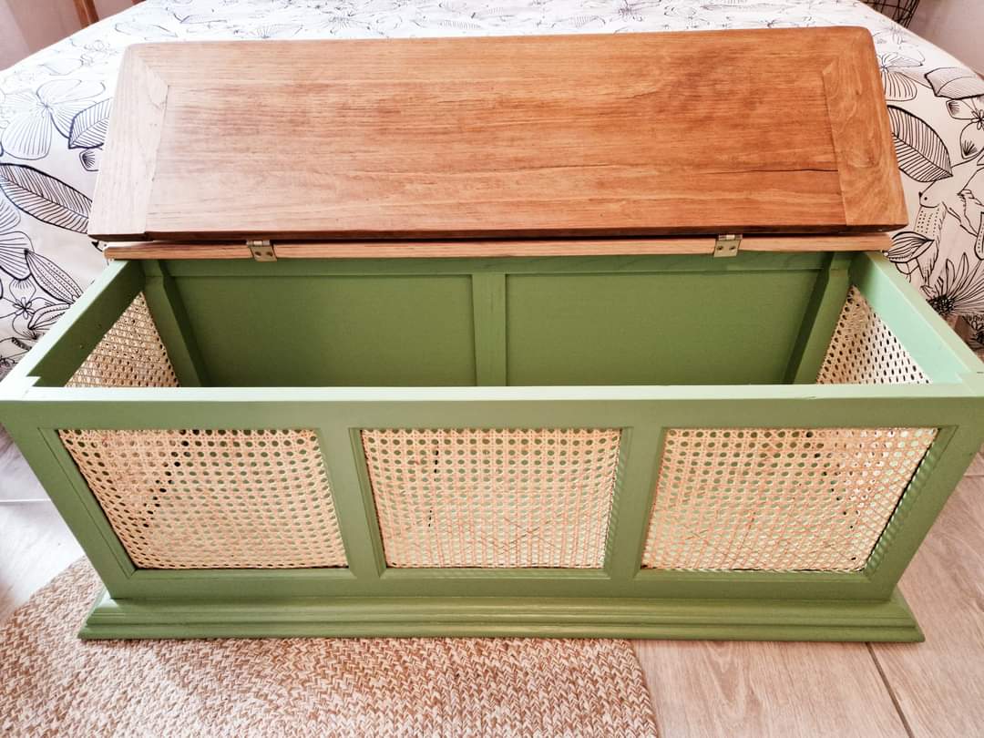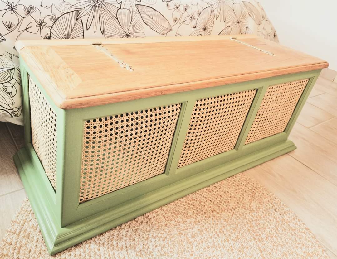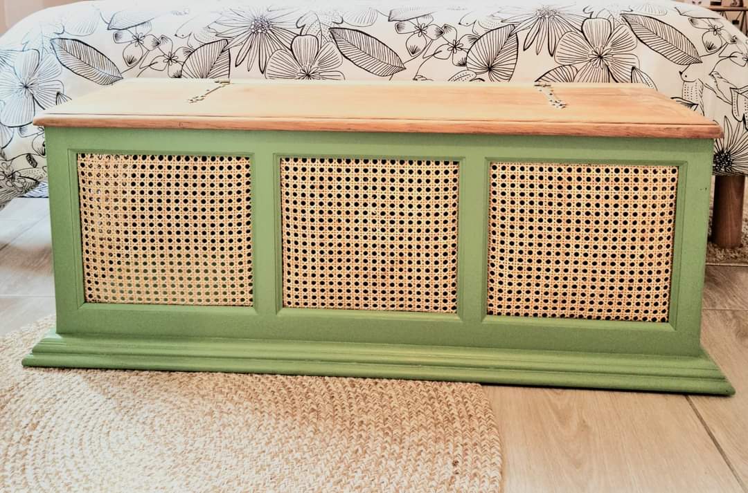 Je vous présente un coffre de rangement, banc bout de lit : Coffre de rangement, banc bout de lit en chêne vert et habillage en cannage.