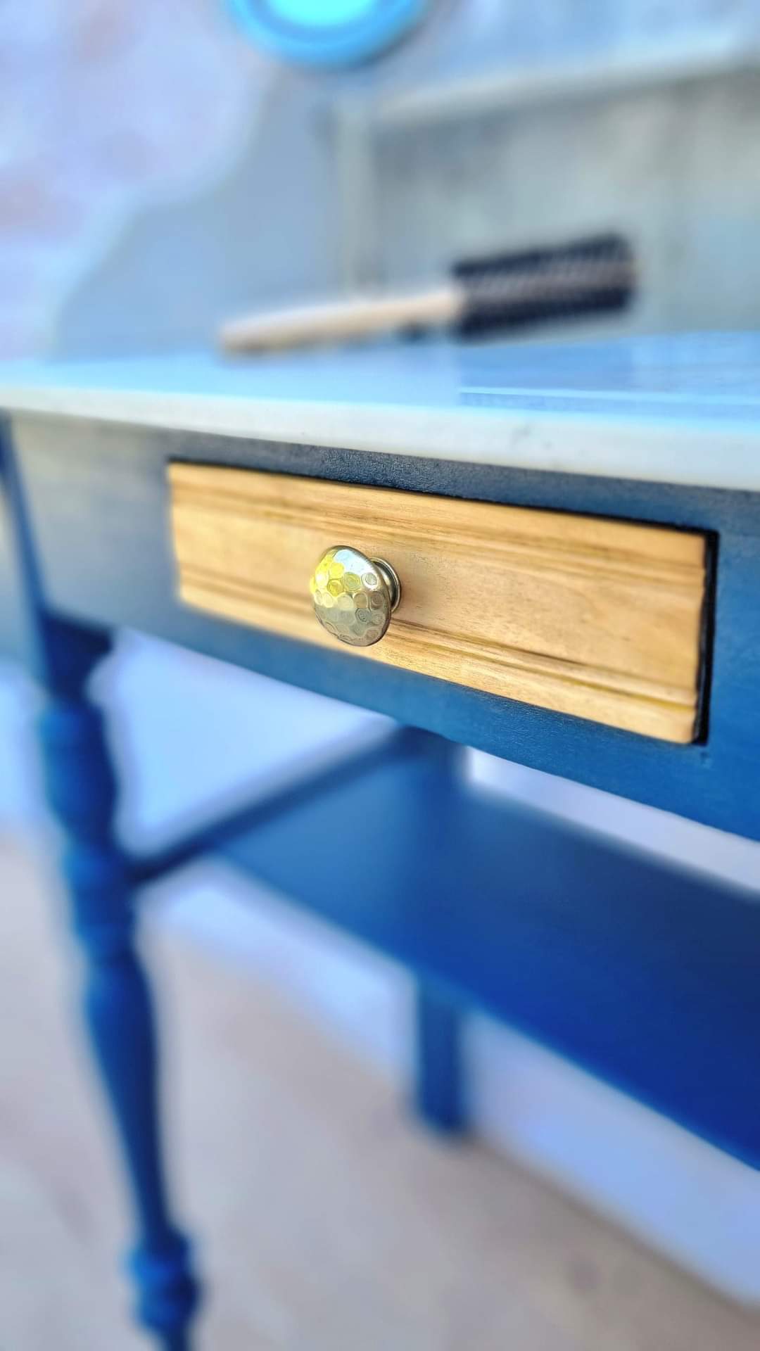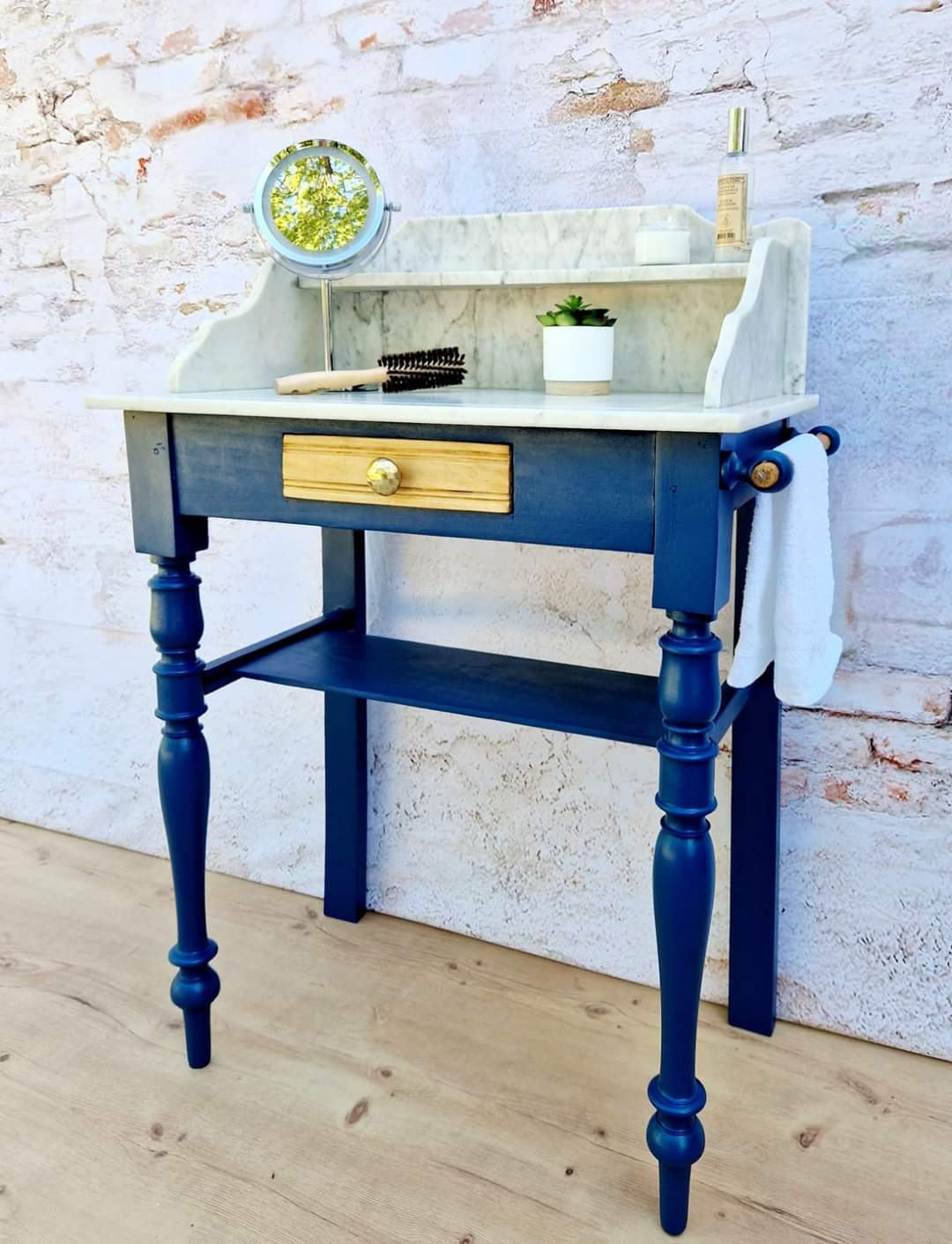 Je vous présente une coiffeuse :Coiffeuse bleue et marbre blanc, bouton doré.